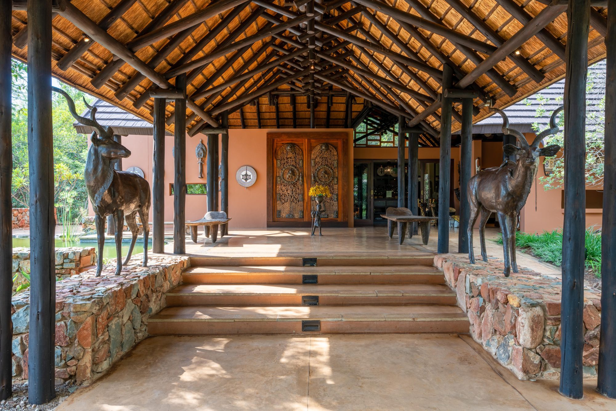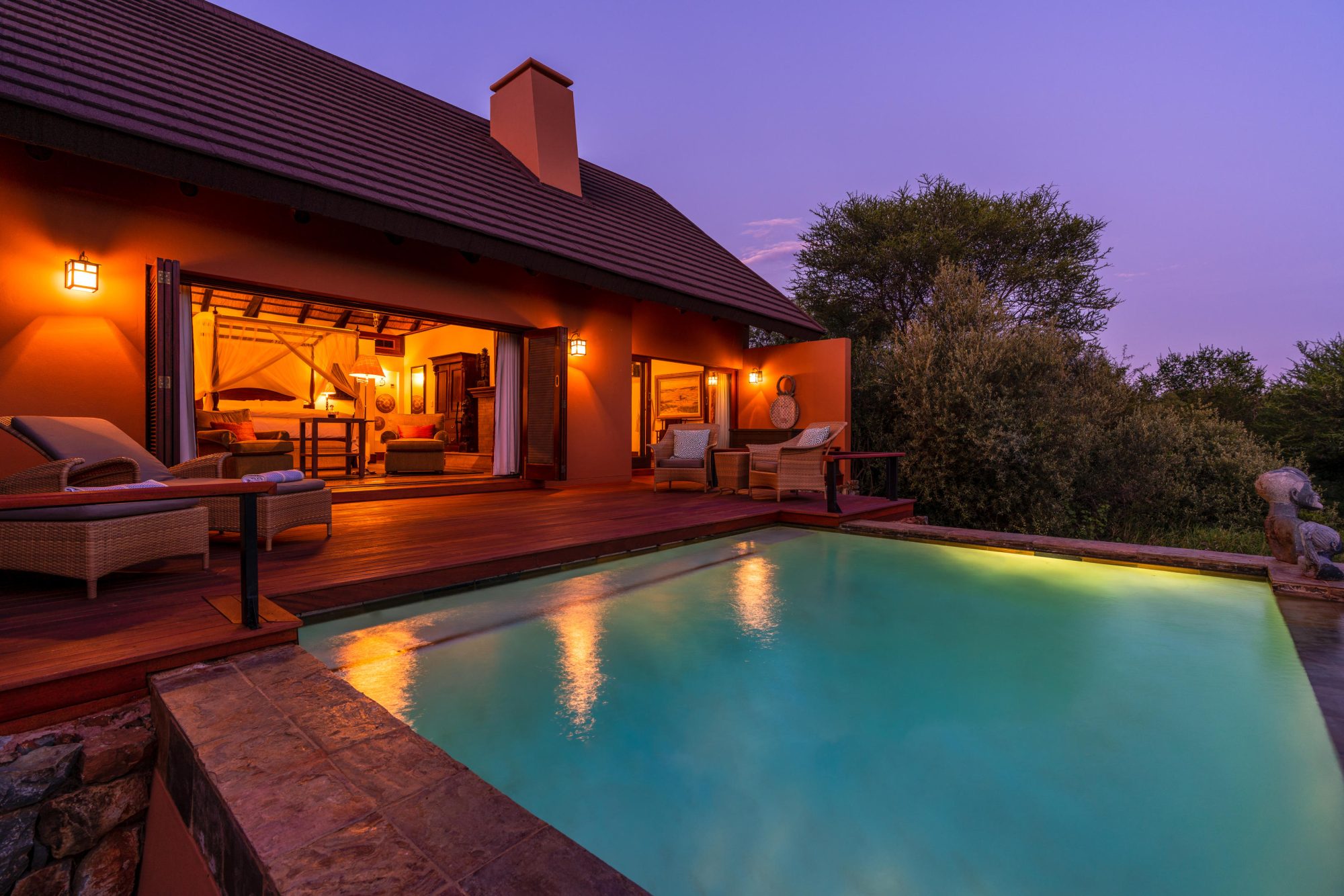 Perched amidst the rocky outcrop of the Gabbro hills, the lodge encompasses dining, lounge, and relaxation areas, offering elevated vistas and uninterrupted views of the reserve. The suites, arranged in a radial configuration around the hills, each boast a private rim-flow pool deck and a natural window sala overlooking the waterhole or surrounding plains.